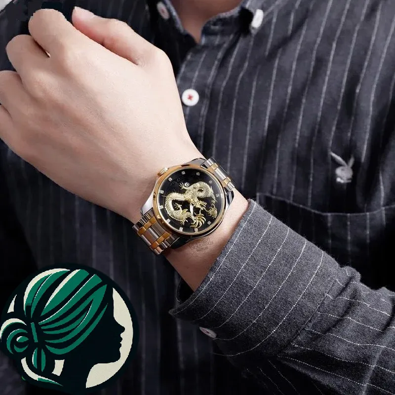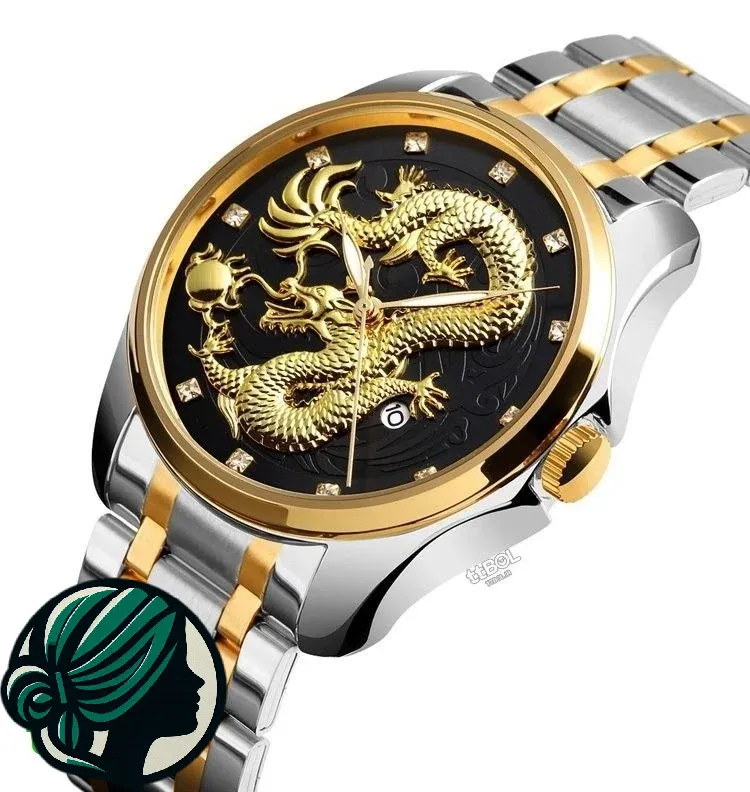 - طراحی الهام گرفته از اژدها: نماد قدرت، خرد و شانس در فرهنگهای شرقی، اژدهای طلایی حک شده بر صفحه مشکی، جلوهای باشکوه و اثیرگذار به ساعت میبخشد.