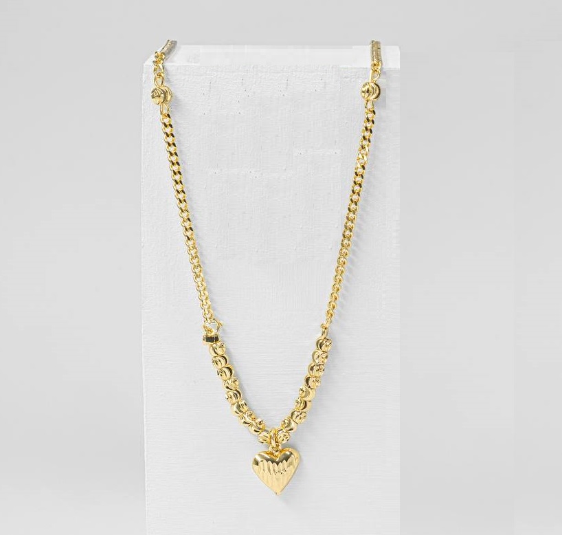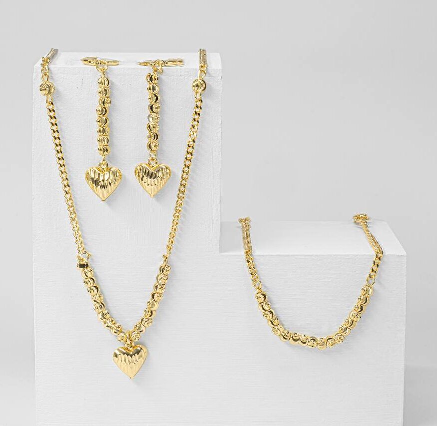این سرویس جواهرات زیبا شامل یک گردنبند، یک جفت گوشواره، و یک دستبند است که با آویزهای قلبی طراحی شدهاند. رنگ طلایی این سرویس ثابت و بادوام است و درخشش خود را در طول زمان حفظ میکند.